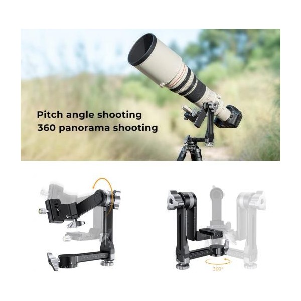 Tête panoramique à 360 degrés : permet une rotation de la base panoramique et du bras vertical à 360°. Le bras peut obtenir un réglage d’horizontal et vertical jusqu'à 100 mm. L'appareil restera maintenu grâce a une forte force de verrouillage.
