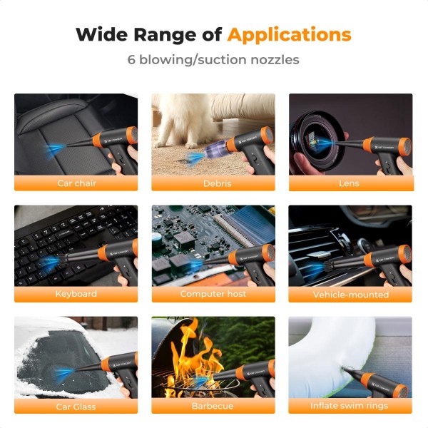 Il est livré avec 6 ensembles de buses/brosses et 5 chiffons d'aspirateur, qui peuvent répondre à toutes sortes de demandes de nettoyage, ordinateurs portables, intérieurs de voiture, sièges, et peuvent également être utilisés pour les pique-niques en plein air pour souffler des feux, sécher les cheveux des personnes et des animaux domestiques, des bouées de natation gonflables et enlever la neige et les feuilles de la surface de la voiture, etc.